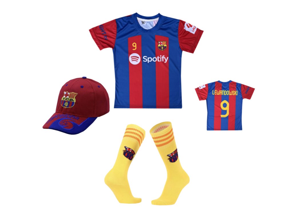 Premium dětské fotbalové tričko + kšiltovky a ponožky FC Barcelona - Lewandowski 9