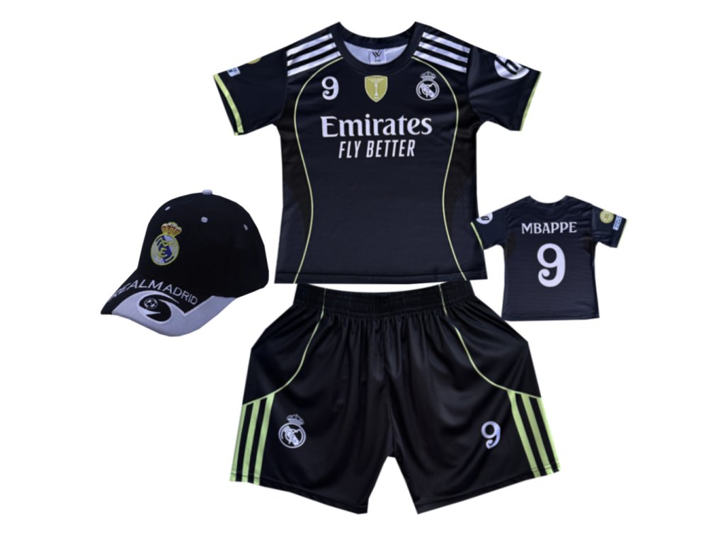 Premium dětský fotbalový dres + fotbalová kšiltovka FC Real Madrid - Kylian Mbappe 9(Emirates Fly Better)