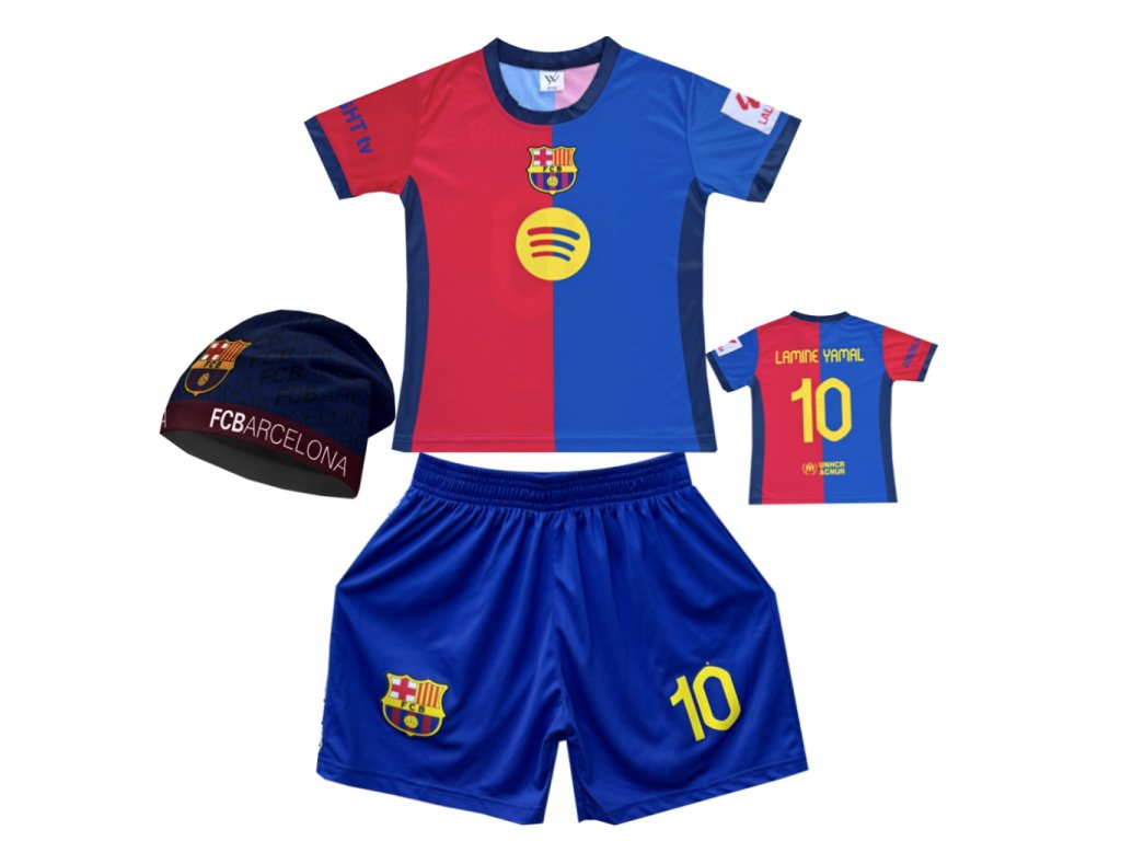 Premium dětský fotbalový dres Komplet + fotbalová pletená čepice FC Barcelona - Lamine Yamal Č.10